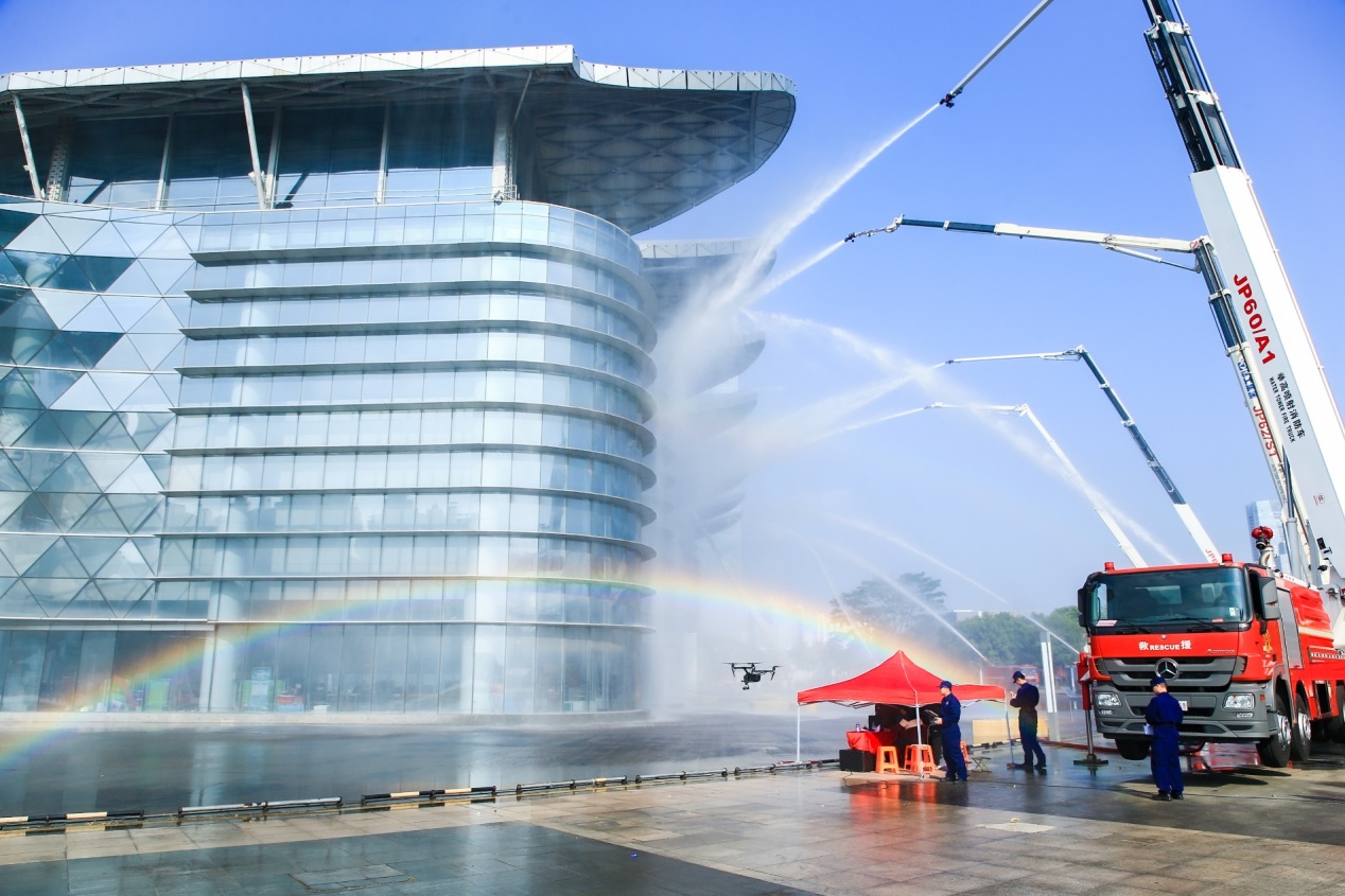 如何安全、快速的疏散和救援消受困人员?启动仪式后,活动现场进行消防情景演练,现场逼真模拟,让市民身临其境。直升机飞机演练航空救援,举高喷射消防车高空喷水,高空救援受困人员情景模拟,引来市民围观和惊叹。