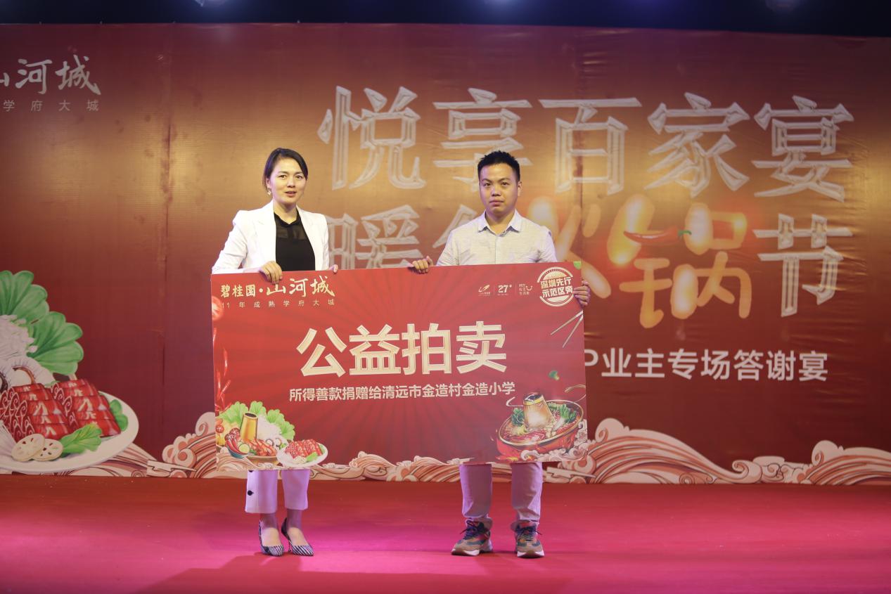 答谢宴活动还进行了一项温暖的公益竞拍活动,业主通过竞拍家电、车位的形式为贫困地区的乡村小学捐赠,为学生们购买阅读书籍和学习文具等。捐赠的学校是位于清远市英德金造村的金造小学,目前有113名学生。金造村是碧桂园在清远扶贫帮扶的新农村项目。活动现场业主通过爱心竞拍为金造小学捐出3万元的爱心款。
