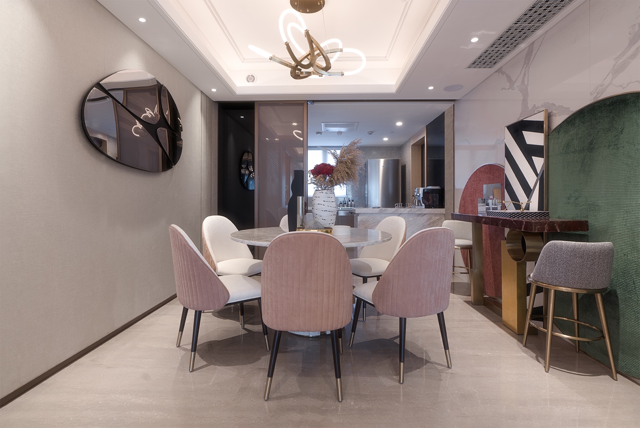 同样作为“资本圈第一时尚先生”郑忠先生的设计作品,“雅境”系列185 ㎡样板房与熠境的稳重、低调、奢华不同。其在设计上更注重体现生活的品质以及对时尚感的传达。整体以浅色调为主,给人简约、高贵的品味感。同时浅色设计也能拉升空间,提升空间感受。高雅、明媚的设计风格,打造出轻奢华美的空间视觉以及高端时尚的空间格调,可谓是“雅致时尚”的完美呈现。