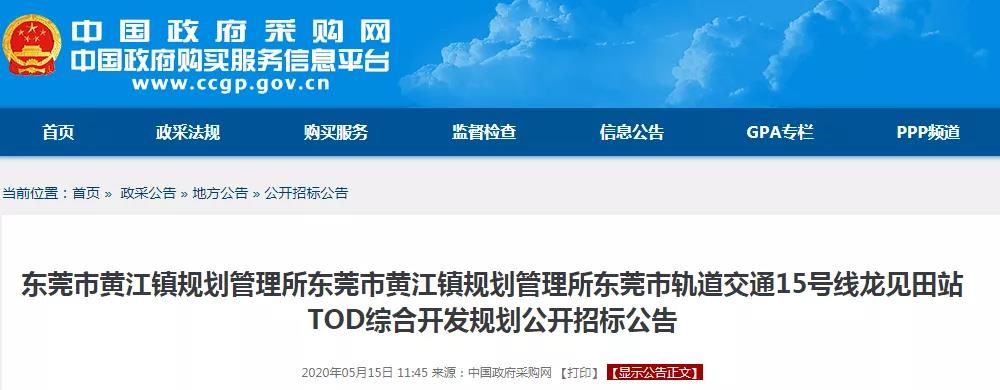 5月15日,东莞市政府采购网挂出了东莞市黄江镇规划管理所东莞市轨道交通15号线龙见田站TOD综合开发规划公开招标公告。