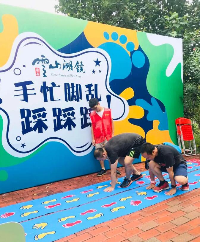 游客抵达第一个站点,在现场工作人员的指导开始挑战这个项目,分为2组进行比拼,选手只能用手和脚去触碰地面上的图案,如:画脚丫的就用脚踩,画手的就用手去触碰,同时身体其他部位不得接触除图片以外的区域,否则视为犯规。最先抵达终点的选手获胜便可以获得一个通关印章。