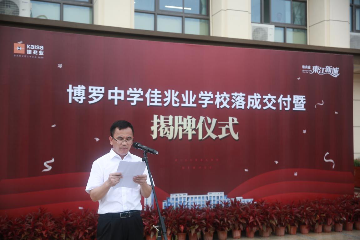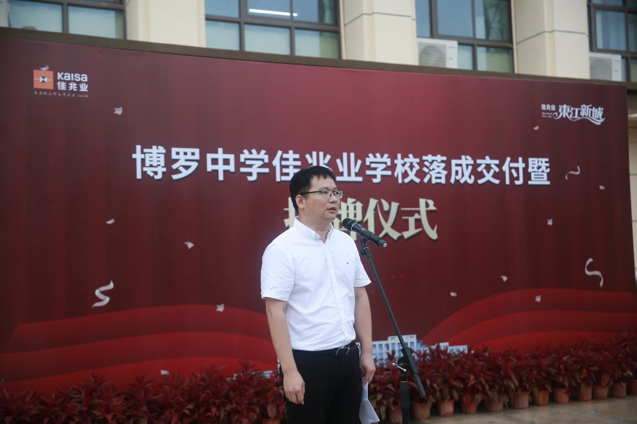 “百年大计,教育为本”,博罗县委常委张建光在致辞中表示,新落成的博罗中学佳兆业学校,是江南片区的一项重大民生工程,惠及千家万户,未来还将配建一所高中和一所小学。希望在今后的办学过程中,学校能以提高办学质量为己任,钻研教学,努力为社会培养有用人才。