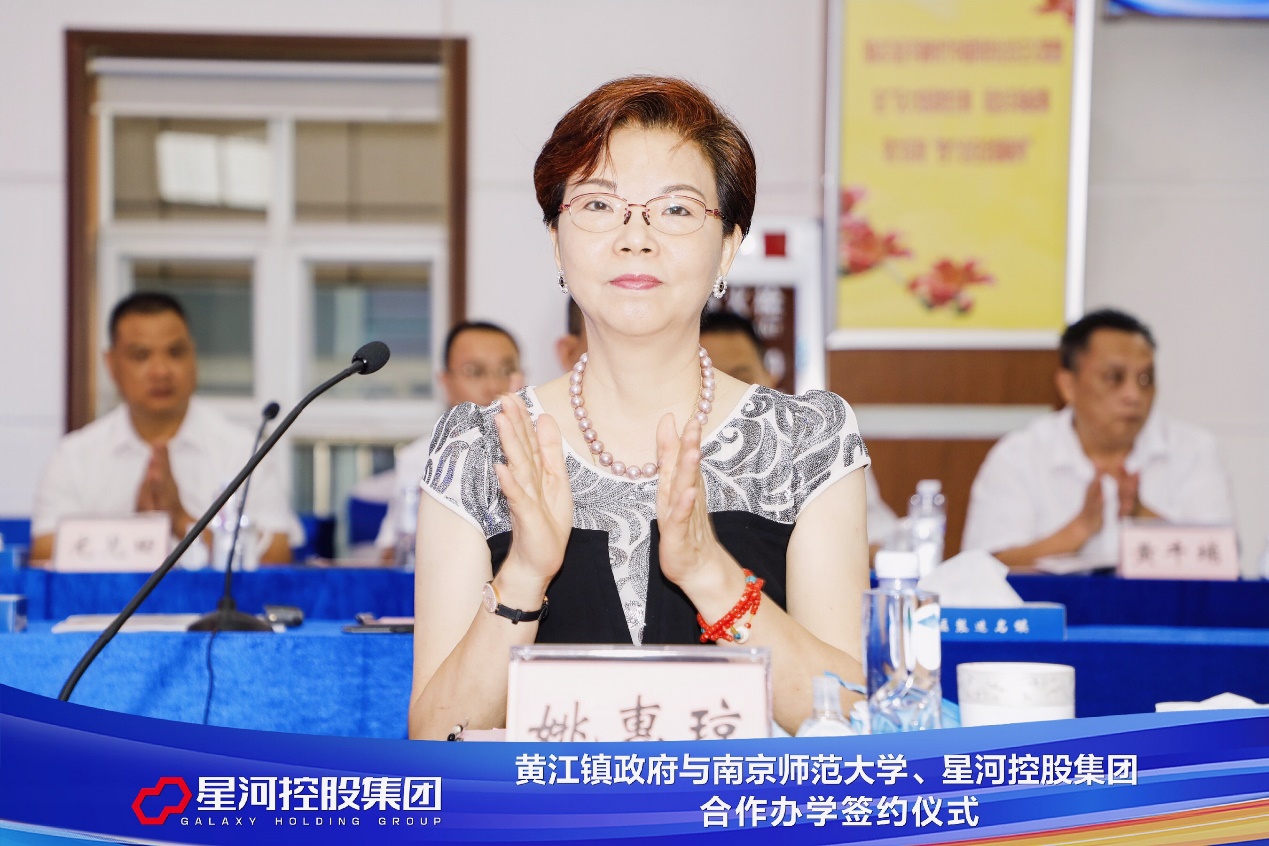 “星河,成立32载,布局29座城,总资产超千亿,以强大的资源整合能力,多维度参与城市生态系统建设,不断践行城市运营引领者的可持续发展之路。星河落子黄江,将依托科技成果转化、科创产业等资源,把握大湾区的历史性机遇,致力在星河(黄江)人工智能小镇实现创新链、产业链、资本链的深度融合,助力东莞产业转型升级。此次星河有幸与南京师范大学展开深入合作,将百年名校更优质的教育资源、更完善的人才培养模式、更浓郁的文化底蕴带到黄江,为东莞的公办教育事业贡献星河的一份力量。”星河控股集团副董事长兼总裁姚惠琼在致辞中表示。