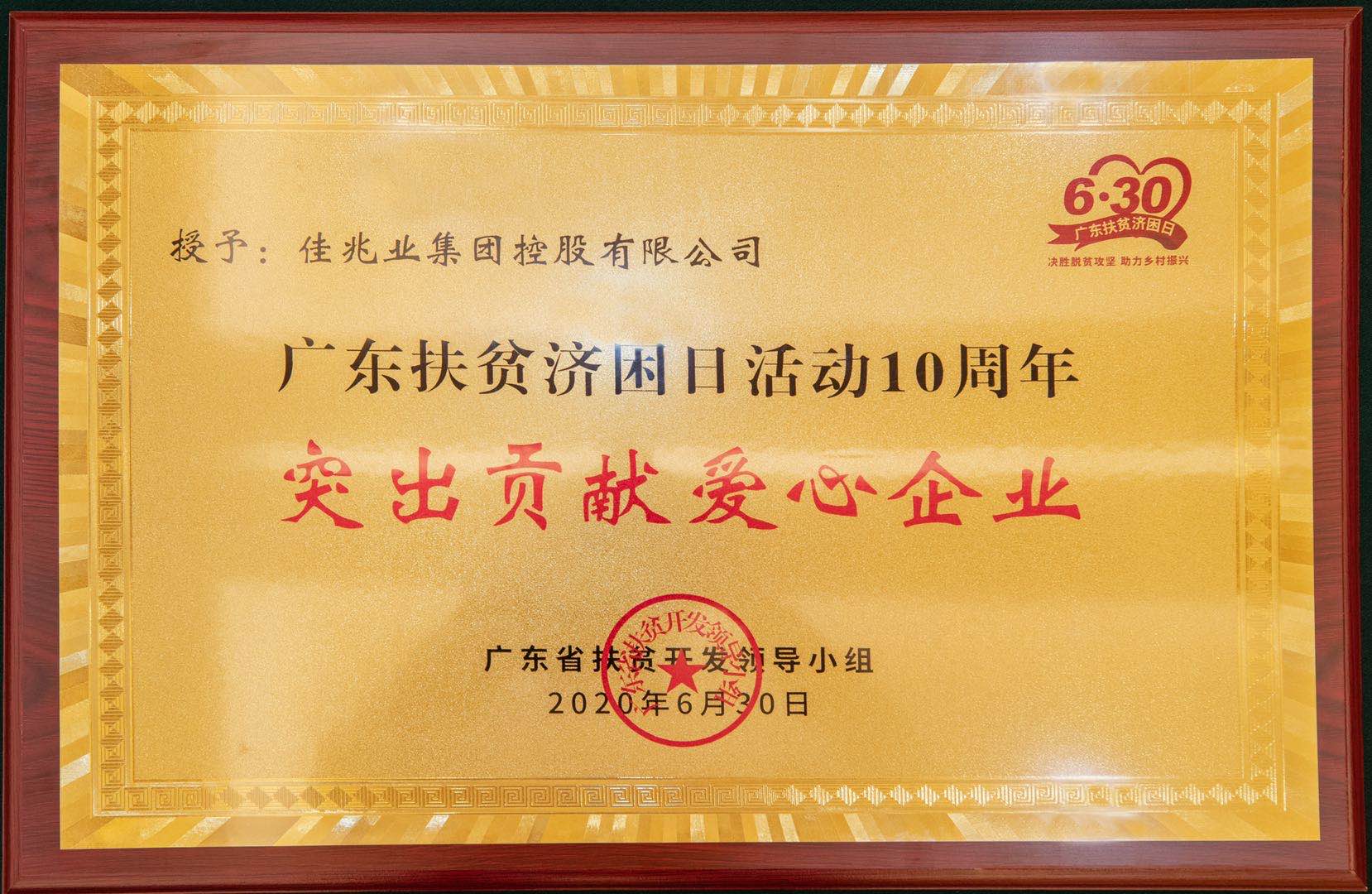 凭借在精准扶贫工作中的卓越贡献,2020年6月30日,广东省扶贫开发领导小组授予佳兆业“广东省扶贫济困日活动10周年突出贡献爱心企业”、“2019年度广东扶贫济困红棉杯金杯”奖,对佳兆业过去的扶贫济困工作予以充分肯定。