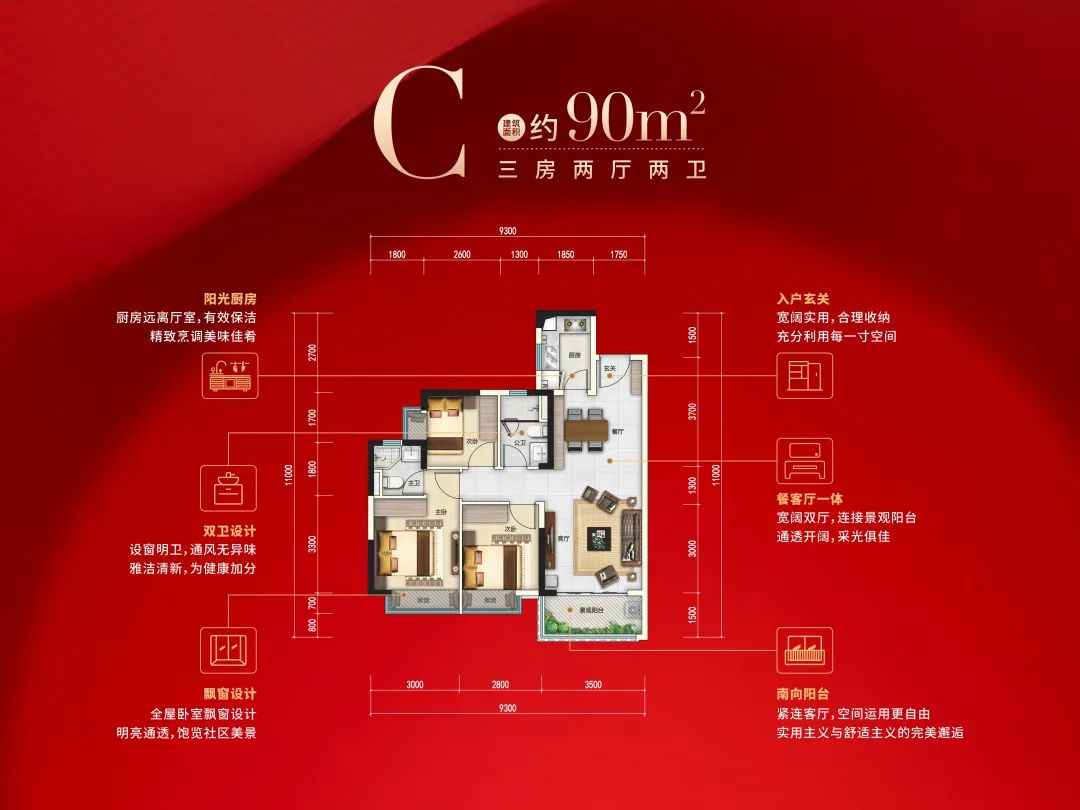 项目建筑面积约90㎡户型示意图