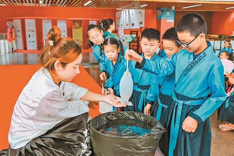 活动中,小小营员们穿着汉服,化身为小小书生,走过文化长廊,在古色古香的展馆中学习非遗民俗文化和国学文化,近距离观摩砚台陈列馆、文字馆、染绣馆、年画馆、皮影馆、石磨机械等非物质文化遗产项目体验馆。场景式的互动体验,让小小营员们沉浸在非遗文化里,与过去对话,加深其对非遗传承和国潮文化的认识和理解,感受国家非遗文化的厚重及古人科技力量的强大。