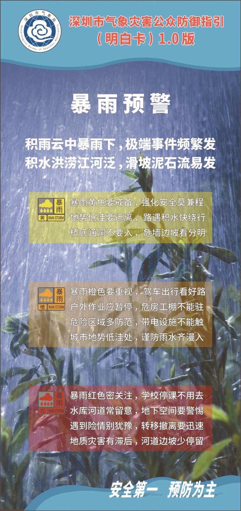 昨日,深圳多区出现强降雨,深圳市发布分区暴雨黄色预警信号、暴雨橙色预警信号和全市雷电预警信号。深圳本周雷雨频繁,局地暴雨大暴雨还将持续。天气不稳定,出行需留意。如果您还不知道暴雨预警信号为何意、需要如何防范,别着急,这份暴雨防范措施请收好!