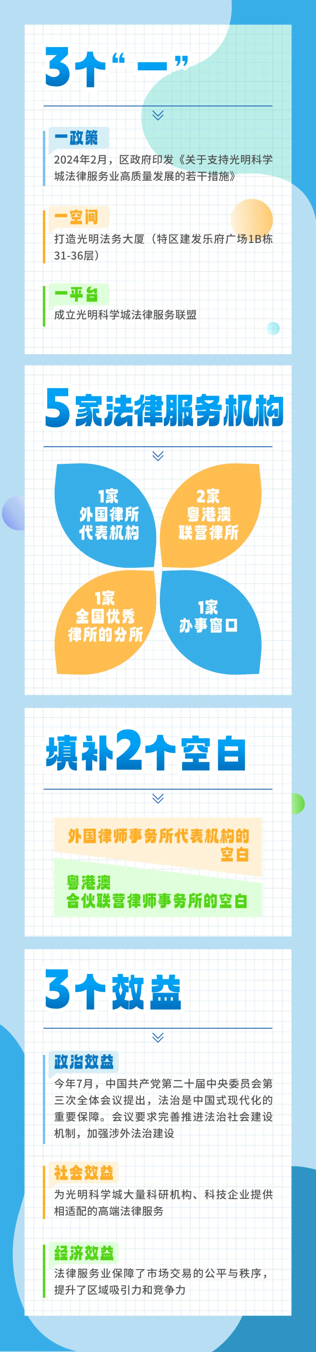 一政策——推出《关于支持光明科学城法律服务业高质量发展的若干措施》。作为光明区首个法律服务业专项支持政策,围绕法律服务业集聚、法律服务业高质量发展、法律服务人才支持、粤港澳大湾区法律服务合作4大方面,出台16项具体措施,对法律服务机构和法律服务人才提供全方位支持。
