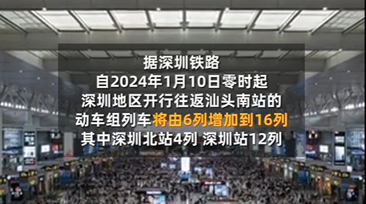 自1月10日零时起,深圳铁路将实行新的列车运行图。其中,深圳地区开行往返汕头南站的动车组列车将由6列增加到16列,往来福田站和香港西九龙站的列车将由每日74趟增加至98趟...... 【详细】