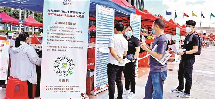 在举行招聘会的同时,龙华街道还在活动现场设置了就业指导服务点、法律法规咨询服务台,为求职者、企业和居民发放就业创业政策宣传手册,提供就业创业优惠政策服务咨询、个人信息登记、工作岗位查询等服务,共派发宣传资料2万余份。相关负责人介绍,龙华街道还提供线上公益招聘会入口,户籍居民、广大来深建设者可扫码关注“深圳龙华就业”微信公众号,了解更多就业政策、企业情况、岗位信息等资讯,也可登录“深圳市龙华区公益招聘网”轻松在线找工作。