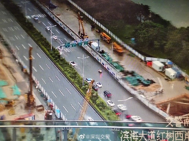 @深圳交警发布消息:滨海大道红树林路段东行方向右侧两车道有积水,提醒过往车辆靠左侧缓慢通过,注意安全。