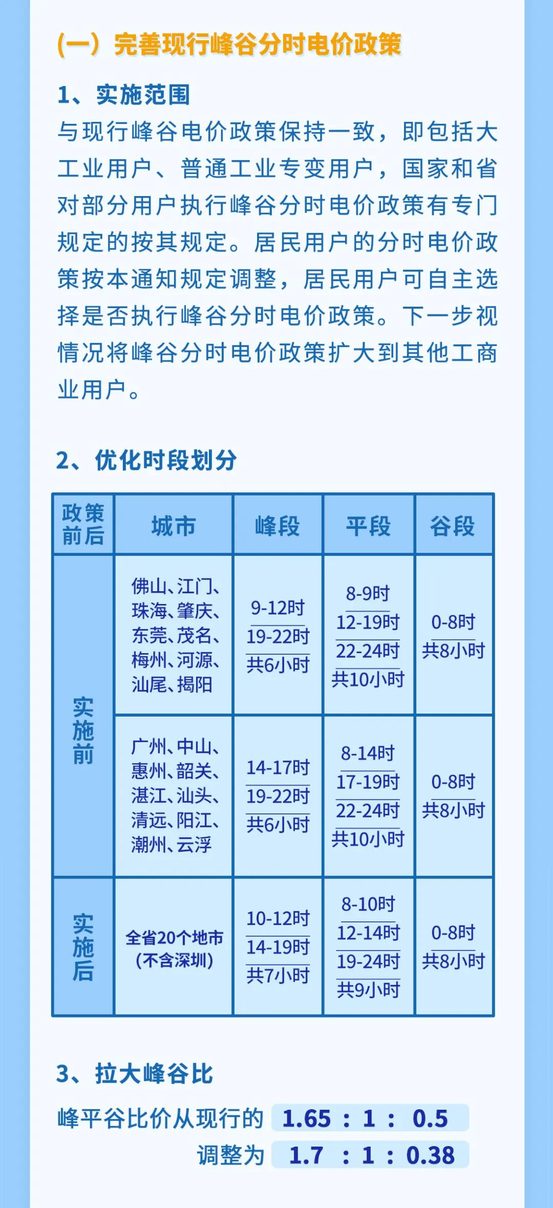 根据8月31日广东省发展和改革委发布的《关于进一步完善我省峰谷分时电价政策有关问题的通知》(以下简称《通知》),自今年10月1日起,广东将拉大峰谷电价差,峰平谷比价从现行的1.65:1:0.5调整为1.7:1:0.38。
