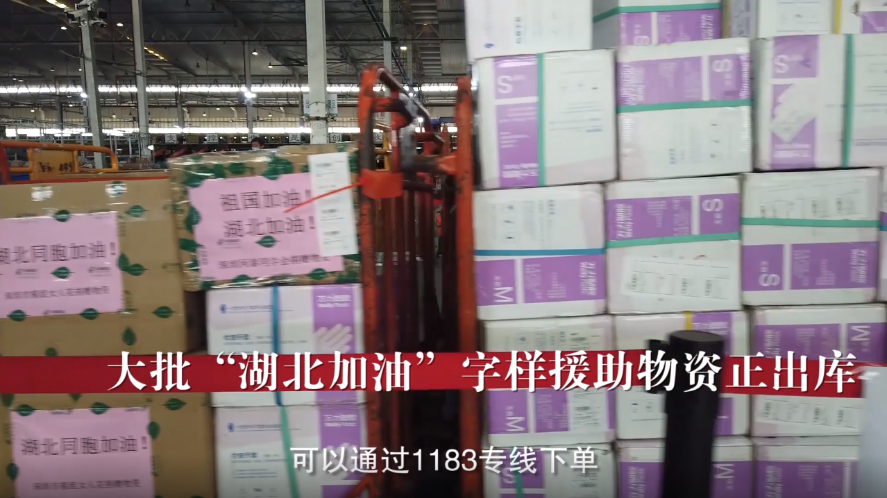 大批“湖北加油”字样援助物资正出库