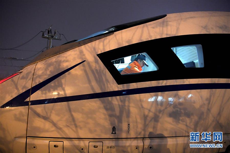 1月29日,王瑞在合肥南动车运用所存车场走向下一辆动车。
