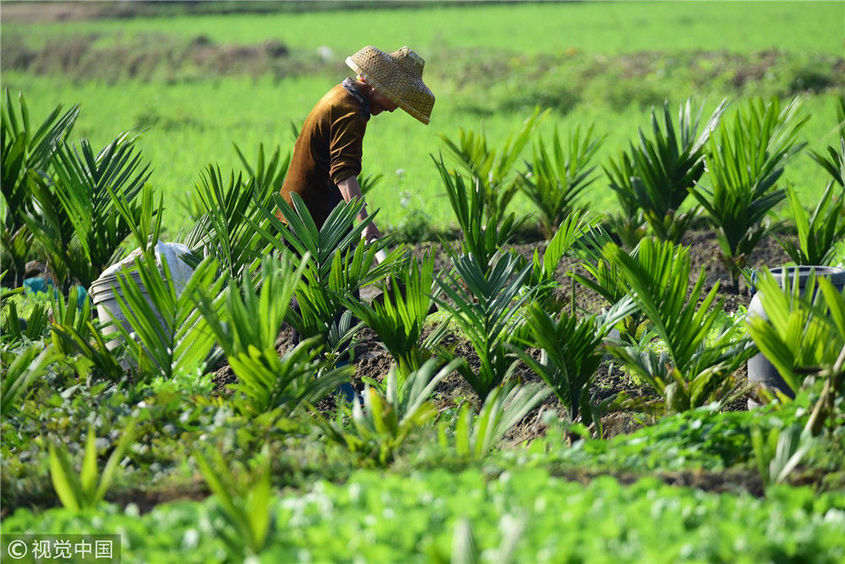 2019年2月2日,海南琼海,“立春”临近,春风率先唤醒海南沉睡的大地,吹皱了一池春水。花草鸟虫鱼从寒冬中醒来,大地恢复了生机。绿色世界一片鸟语花香。勤劳的农民在田园中耕耘播种,用双手播种他们坚定的信念和永远不变的希望。图为2019年2月2日,海南琼海,嘉积镇的农民在春光明媚的田园中劳作。