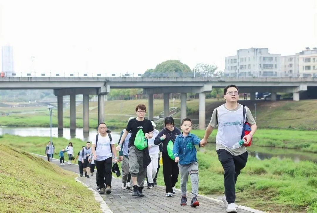 沿着坪山河畔,大家精神饱满、步伐矫健,山河水清澈见底、碧波荡漾。看,还有几只白鹭正在水里嬉戏。
