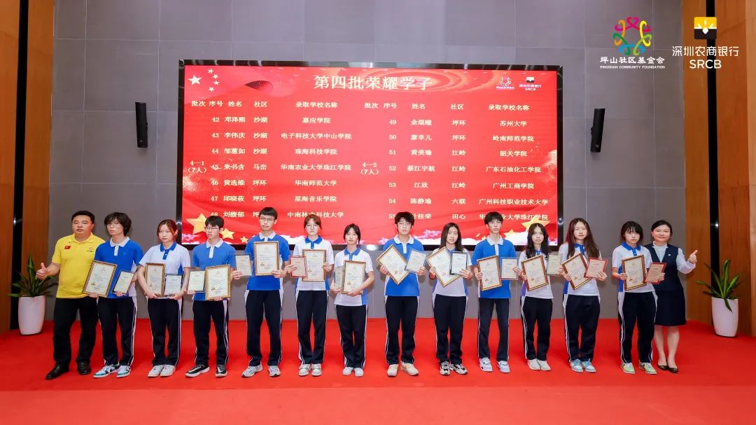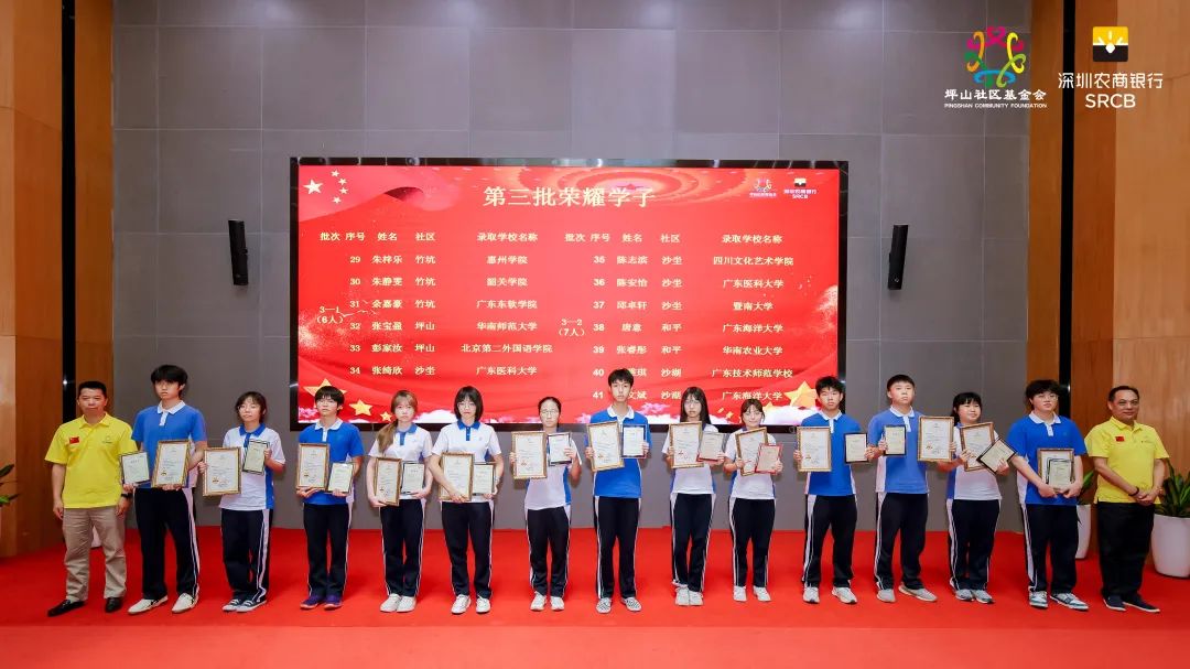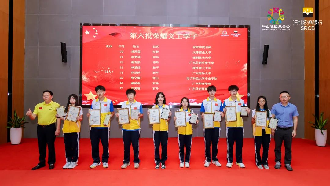 坪山社区基金会及深圳农商银行坪山支行负责人为受表彰学子颁发了奖学金牌匾,希望学子们继承革命传统、传承红色基因,再接再厉、脚踏实地、积极向上、勤奋进取,为实现梦想而努力奋斗。