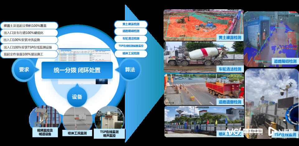 “远程喊停3.0”非现场监管系统,是以开发AI视频算法对工地裸土覆盖、出入口冲洗、车行道硬底化等关键环节进行抓拍,利用工况系统监督围挡喷淋运行情况,发现问题及时通过区智慧管理指挥平台分拨督办,实现对工地超时施工、噪声超标和扬尘防治“6个100%”措施落实情况全流程、全要素、全方位AI智能闭环监管平台。