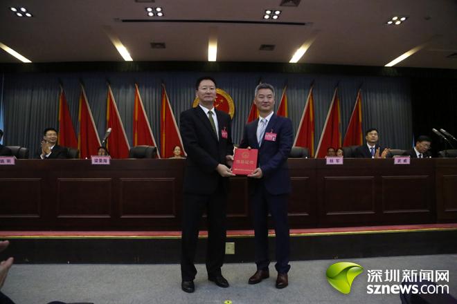 杨军正式当选为盐田区人民政府区长,并接过盐田区人大常委会主任梁景海颁发的当选证书。