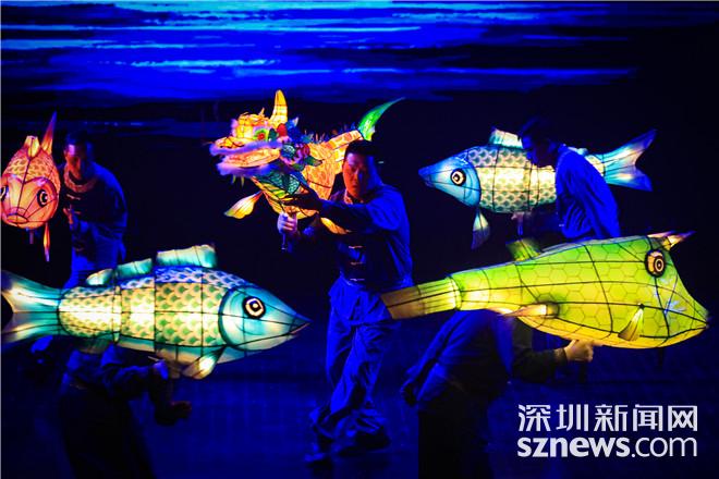舞台上,中英街沙栏吓村村民借鉴鱼在水中的动作,以舞动鱼灯为祭祀方式,灵动展现客家渔耕文化的。随着音乐声起,数只鱼灯不断变换阵型,有“鱼尾摆动”、有“小鱼绕圈”,还有“小鱼尾随大鱼”,在舞者的灵巧操纵下,鱼儿于暗夜中摇曳穿行,宛如灿烂星河,令人赏心悦目,呈现了一个充满生命力的海底世界。