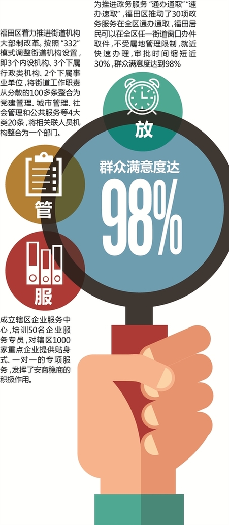 值得一提的是,福田区着力推进街道机构大部制改革。按照“332”模式调整街道机构设置,即3个内设机构、3个下属行政类机构、2个下属事业单位,将街道工作职责从分散的100多条整合为党建管理、城市管理、社会管理和公共服务等4大类20条,将相关联人员机构整合为一个部门,由外部协调变为内部协调,盘活了人力资源,机制设置更为合理。