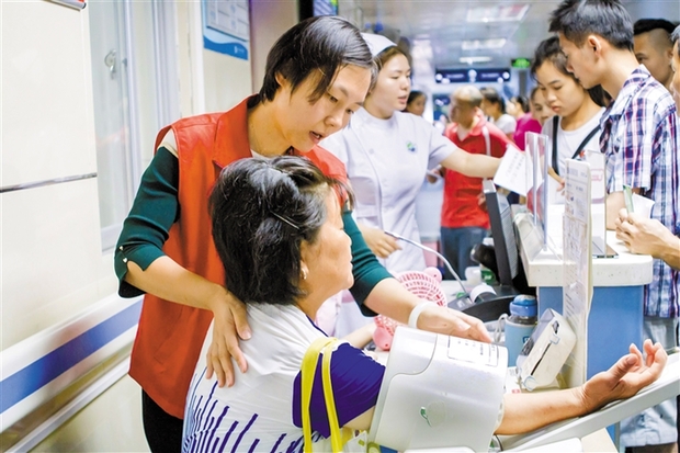建设基层医疗集团将给居民带来很多实惠。这是宝安医院(集团)二院的志愿者为患者量血压。 通讯员张帅宾 摄