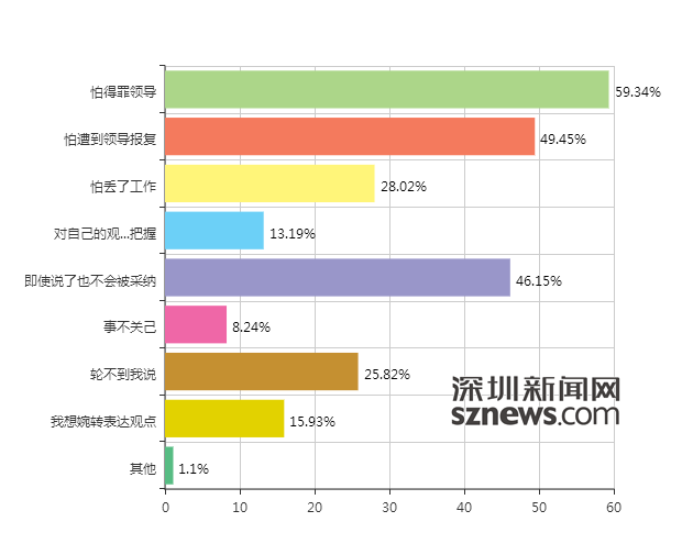 讲真话,难不难?深圳新闻网就此展开了调查《你所在的单位有“说真话”的氛围吗?》,超过一半(54.35%)的网友表示,自己平时是敢说真话的人。然而,有67.58%的人认为,自己所在的单位没有“说真话”的氛围,首要原因是怕得罪领导(59.34%).