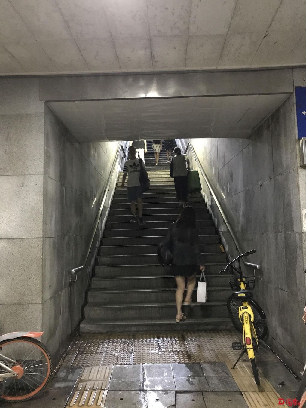 深南大道东门过街通道,雨天漏水,地板破损,台阶没有坡道,行李箱与自行车得靠人扛