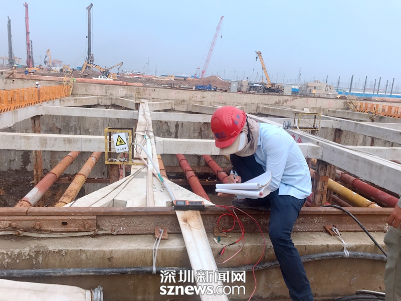 珠西综合交通枢纽施工基地,工作人员在记录数据