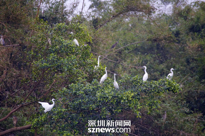 图为“小鸟天堂”,一群白鹭在枝头休憩