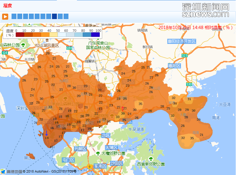 深圳新闻网10月29日讯(记者 陈婕)29日,深圳市最高气温直逼30度,与此对应的是,今日最低相对湿度24%,比今日历史最低值25%(1978、1991年)还要干,真叫一个晴朗干燥。