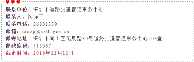 根据《深圳市机动车道路临时停放管理办法》相关规定,市交委现就以上18条道路路边停车泊位设置方案公开征求意见。市民如有意见和建议,可于2018年12月12日前反馈给市交委。邮寄地址为深圳市南山区花果路30号道路交通管理事务中心503室。