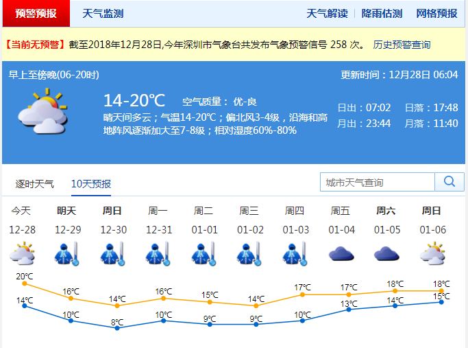 深圳市气象局预计,12月28日受冷空气前锋影响,我市多云间晴天,风力加大,沿海和高地最大阵风7-8级,气温下降,早晚清凉;29日-元月2日受冷空气主体影响,气温显著下降,天气持续寒冷,最低气温在8℃左右,伴有7-9级阵风,间中有小雨。寒冷天气将持续5-6天。