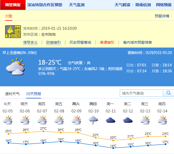 深圳新闻网2019年2月5日讯 深圳初一至初五(5-9日)天气温暖湿润,可见阳光,早晚有轻雾或雾,初一气温18-24℃;初六(10日)起冷空气影响,伴有小雨,气温下降。