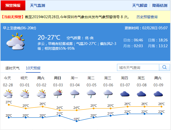 未来三天深圳天气以多云为主 温暖潮湿 今日最高温达27℃