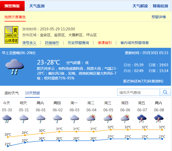 【上班天气】预计早晨6-9时,全市阴天间多云,偶有阵雨;气温23-25℃,相对湿度80%-100%;早晨天气舒适,适合外出活动,无对出行不利影响;白天仍有降雨,外出注意随身带伞。深圳市气象台2019年05月30日05:43发布。