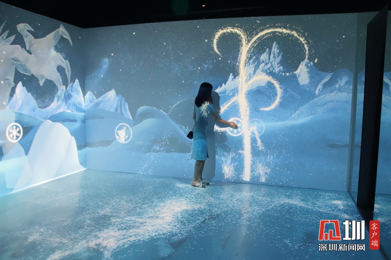 展览还加入了体感侦测技术,冰山雪景随着光影变换而变幻,就如同艾莎女王特别为粉丝们施展的冰晶魔法:足迹所到之处,雪花和冰晶变幻各种魔法特效,用手触摸圆圈,还能在屏幕上升腾起一朵云,或者一串飞舞的雪花。艾莎女王、安娜公主和克里斯托夫也有可能现身在屏幕上