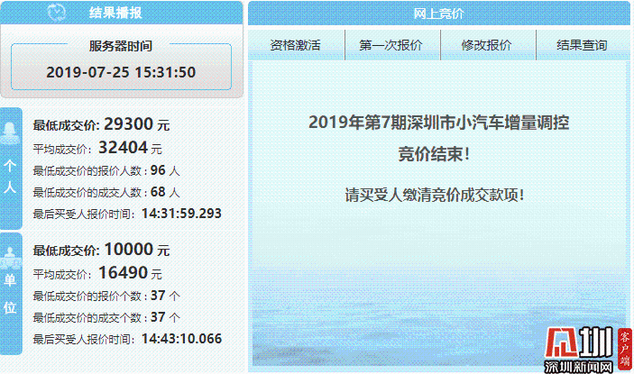 2019年第7期深圳小汽车车牌竞价结果截图