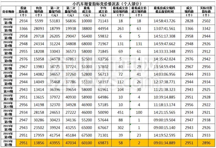 深圳市小汽车增量指标竞价情况表(2018年第一期——2019年第五期)