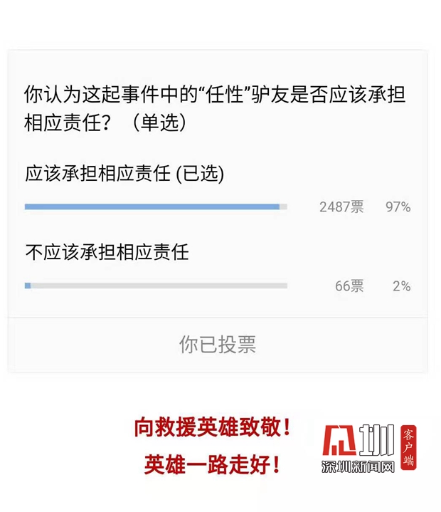 有一个细节是,这批受困的驴友上山溯溪的时间正是深圳发布台风预警信号的时间,因此很多人也认为在台风天探险,驴友过于任性。在深圳新闻网微信公众号发起的小调查(你认为这起事件中的“任性”驴友是否应该承担相应责任?(单选))中,共有2553名网友作答,97%的人认为应该承担相应责任。