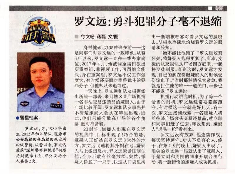 罗文远,男,1989年出生,2013年加入警队,现为深圳市公安局福田分局福田派出所四级警员。从警以来,罗文远荣获“深圳警察神探奖”铜质功勋奖章1次、市公安局个人嘉奖2次。