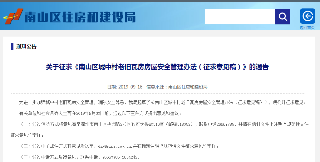 意见稿征集截止至9月30日,有关单位和社会各界人士有意见或建议的要及时进行反馈,更多情况可以登录南山区住建局官网进行查看。