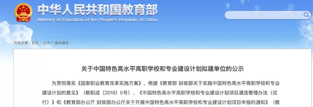 今天上午,教育部和财政部正式发布《关于中国特色高水平高职学校和专业建设计划拟建单位的公示》,经高职学校自愿申报,省级教育部门、财政部门审核推荐,中国特色高水平高职学校和专业建设计划项目建设咨询专家委员会评审,教育部、财政部审定,拟立项中国特色高水平高职学校和专业建设计划建设单位197个(简称“双高计划”),现予公示。公示期7天(2019年10月25日—10月31日)。