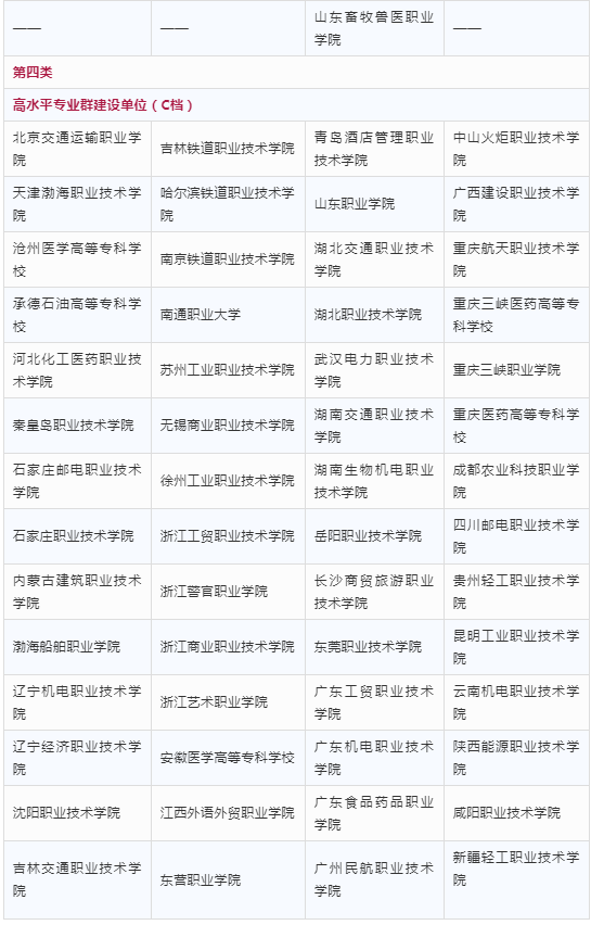 入围“双高计划”的高职院校分为四类,其中第一类包括高水平学校建设单位(A档)10所;第二类包括高水平学校建设单位(B档)20所;第三类包括高水平学校建设单位(C档)26所、高水平专业群建设单位(A档)26所、高水平专业群建设单位(B档)59所;第四类包括高水平专业群建设单位(C档)56所。