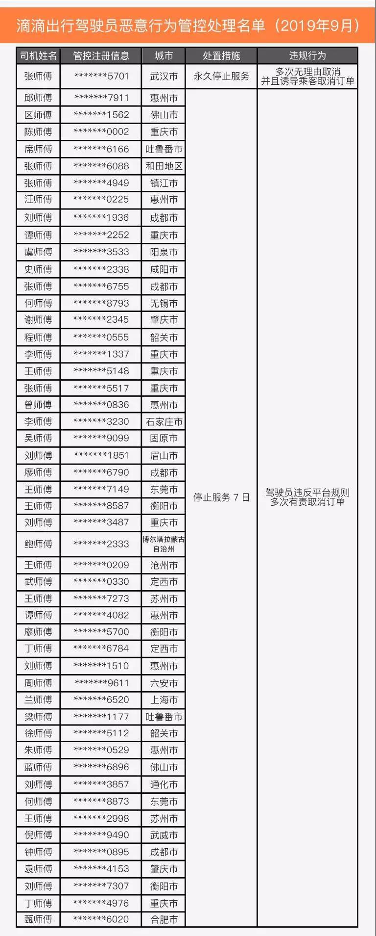 晶报2019年10月25日讯 昨日(24日),滴滴出行微信公众号公示2019年9月部分虚假投诉的乘客以及存在恶意行为的驾驶员名单,名单中包括27名乘客和50名司机。