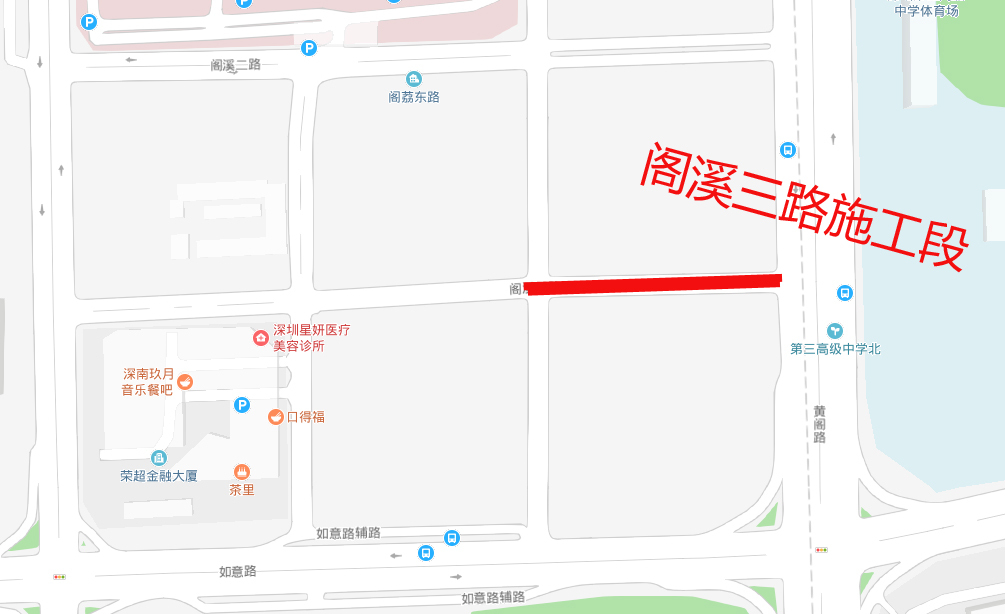 2019年10月28日至2020年1月31日共95天,封闭沙田围三街(如意路口至阁溪三路口段)进行施工。原经此路段通行的车辆,可改沿沙田围二街或周边其它道路通行。