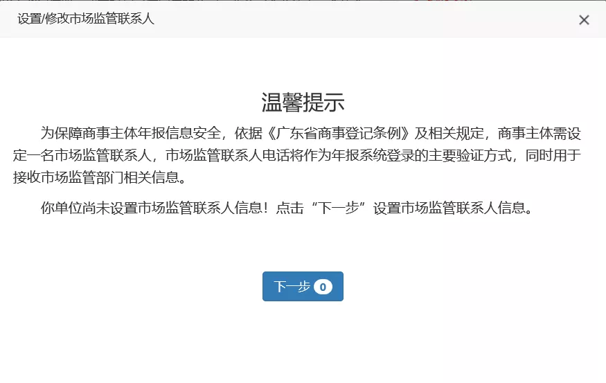 第二步:系统自动弹出市场监管联系人设置提示框,阅读完成后点击“下一步”。