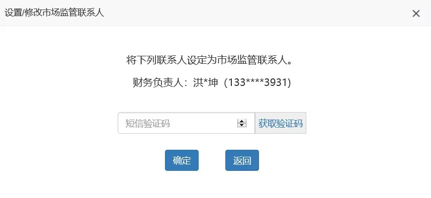 第四步:输入收到的验证码,点击“确定”,完成市场监管联系人设置。