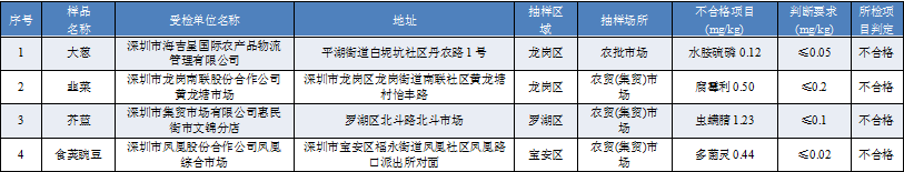 见圳客户端·深圳新闻网2019年11月12日讯 11月11日,深圳市市场监督管理局发布9月16日-9月20日深圳市农产品质量安全猪肉和蔬菜例行监测结果。2019年9月16日-9月20日,深圳市市场监督管理局在全市监测猪肉产品53份,抽检结果显示全部样品合格。抽检蔬菜共124份,4份抽样样品不合格,都为农药检测超标。其中,深圳市海吉星国际农产品物流管理有限公司销售的大葱水胺硫磷超标,深圳市龙岗南联股份合作公司黄龙塘市场销售的韭菜腐霉利超标,深圳市集贸市场有限公司惠民街市文锦分店销售的芥蓝虫螨腈超标,深圳市凤凰股份合作公司凤凰综合市场销售的食荚豌豆多菌灵超标。