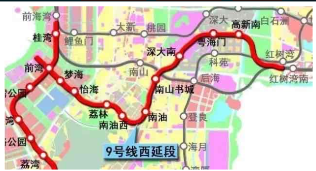 地铁9号线西延线(二期)线路东起红树湾南站,经深圳湾至前海湾,全长约10.8公里,站点为前湾、梦海、怡海、荔林、南油西、南油、南山书城、深大南、粤海门、高新南、红树湾南。其中,换乘站为5座,在前湾站换乘5号线、南油站换乘12号线、深大南站换乘15号线、粤海门站换乘13号线、红树湾站换乘11号线。